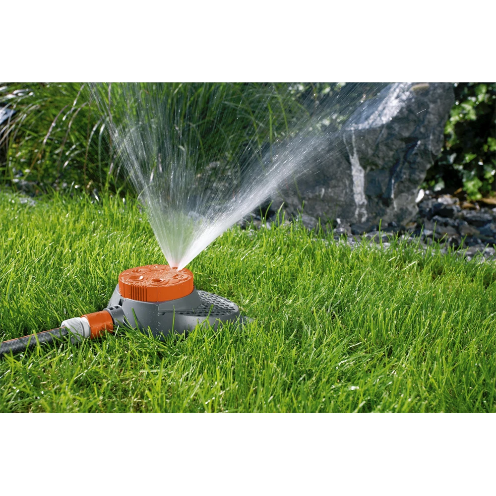 De GARDENA Classic 6-sproeier Boogie is een sproeier met 6 verschillende besproeiingsmogelijkheden. Voet voor stabiele plaatsing en makkelijk te verplaatsen. Gewenste besproeiingsvorm kan met keuzeschijf eenvoudig worden aangepast. Hele cirkel: max. diam. 10m/80m². Halve cirkel: max. straal 8m/100m². Vierkant: max. 8x8m/64m². Vlakke straal: max. 16x2m/32m². Ovaal: max. 3x5m/11m². Kleine cirkel: max. diam. 1,5m. 4-kleuren displaydoos.