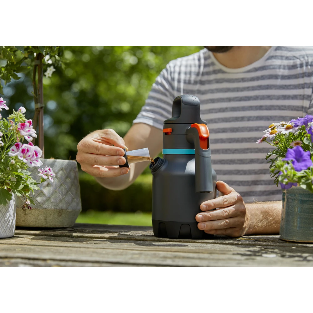De drukspuit van 1,25 l van GARDENA is ideaal voor de verzorging van uw balkon- en terrasplanten. Veel handige functies zorgen voor een eenvoudige bediening met veel gebruiksgemak, ongeacht of u uw planten wilt sproeien of extra bescherming wilt bieden met een zelfgemaakte insectenspray. Voor het vullen, afmeten van vloeistof en legen van het reservoir is de tweede opening inclusief de maatdop op de behuizing een handig hulpmiddel en blijven uw handen droog tijdens het gebruik van de drukspuit. Voordat u begint, moet u de druk in de drukspuit opbouwen met de ergonomische D-handgreep die is voorzien van een eindstopbuffer. Daarna hoeft u alleen op de knop op de handgreep te drukken. De ingebouwde 360°-functie zorgt dat er altijd vloeistof wordt aangezogen tijdens het spuiten, ongeacht de stand waarin de drukspuit wordt gehouden. Het hoogwaardige messing mondstuk bevindt zich aan de kopuitlaat van de spuitfles en kan niet alleen worden ingesteld op verschillende intensiteiten (sproeinevel of spuitstraal), maar kan ook worden gekanteld tot een hoek van 90°. Hierdoor kan gemakkelijk onder bladeren worden gesproeid zonder dat u uw pols onder een oncomfortabele hoek hoeft te draaien. Bovendien kan een nylon filter (verkrijgbaar in het GARDENA assortiment) worden gebruikt om zelfgemaakte mengsels toe te dienen. Op deze website vindt u nuttige recepten. Hier vindt u natuurlijke oplossingen voor gewasbescherming, zoals een netelrecept tegen bladluis. Verder kunt u dankzij de transparante kijkstrook op elk gewenst moment het vulniveau van het reservoir van 1,25 liter controleren.